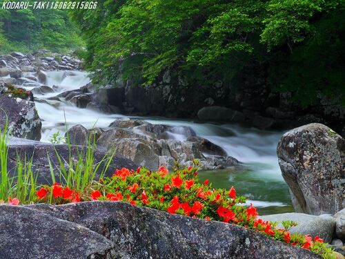 長野県上松町の滝 小川~赤沢の渓谷沿いに木曽川サツキが咲きだしました 焼笹の滝(無名:仮称)にて 2016.06.18 晴れ 真夏のような暑い日 木曽川サツキは渓谷によく映える この上流はまだ咲き始め・・また来よう と 思う?